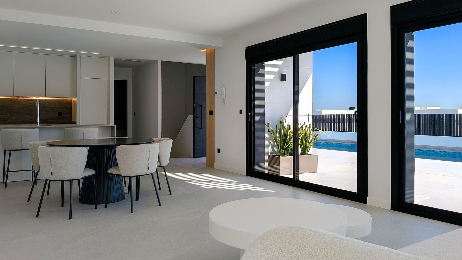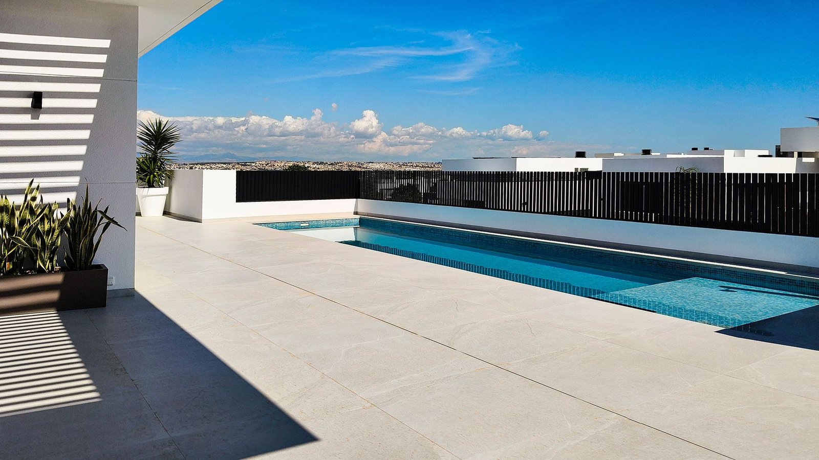 4-bedroom, 4-bathroom villa arranged across two levels on a 300 m² plot in Ciudad Quesada, Alicante — 265 m² of built area with an open-plan kitchen and living space at ground level and four en-suite bedrooms on the lower floor. A private pool runs the full width of the rear terrace, with a large timber-decked sun area. The development is positioned 950 m from an established golf resort and connected by a dedicated cycling lane to the Segura River corridor. Key ready — licensed, complete, and available for immediate transfer.